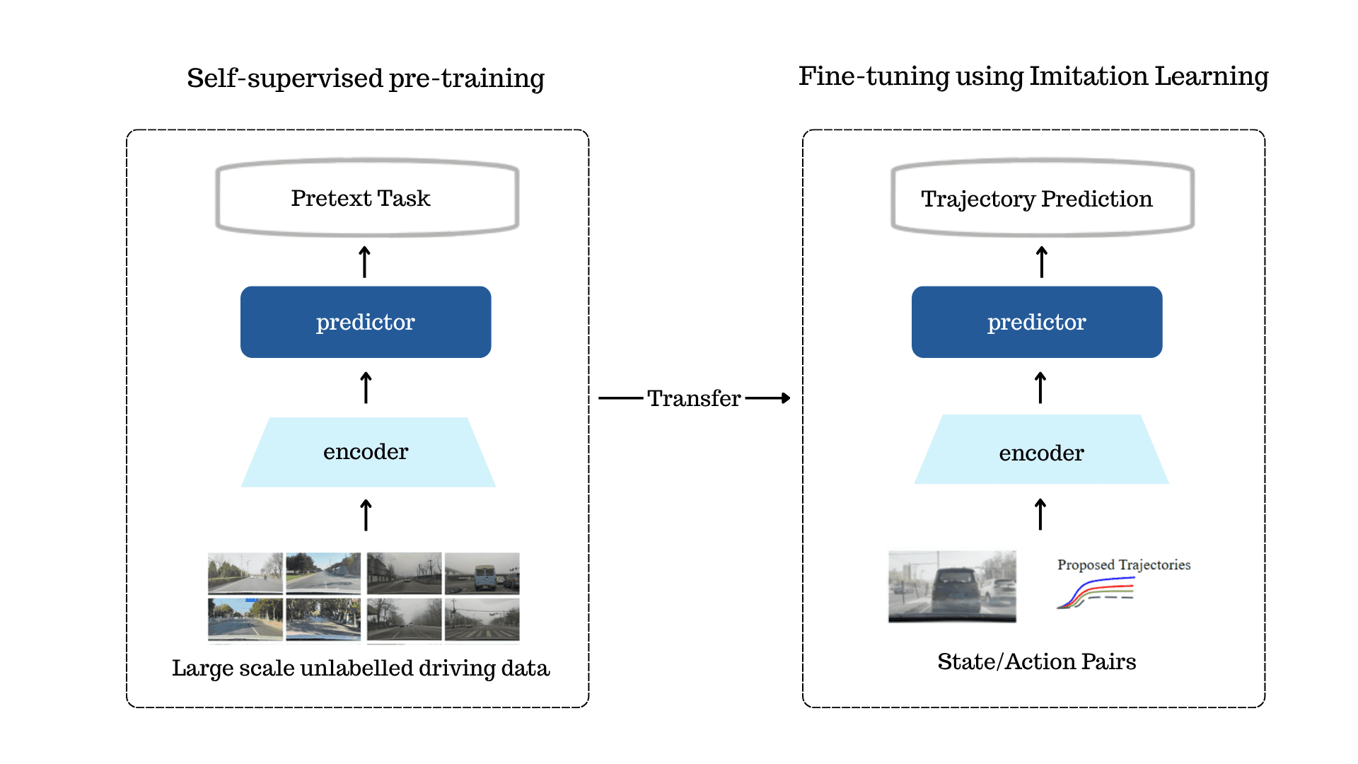 • Fine-tuning the model for downstream tasks of planner by learning to predict trajectories using conditional imitation learning.