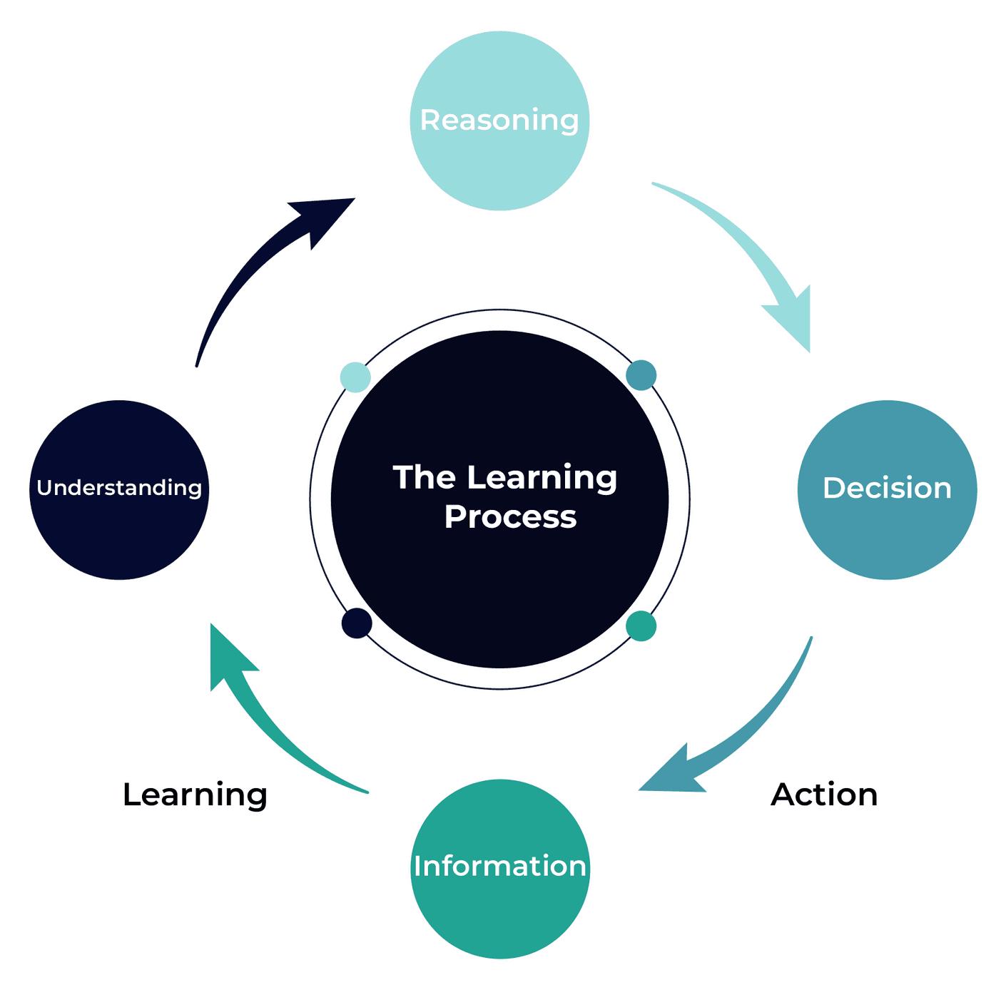 This process is a continuous cycle of having a basic understanding of the world → reasoning to predict & assess consequences → making a decision → ingesting information from our senses → updating our prior understanding of the world, if needed.